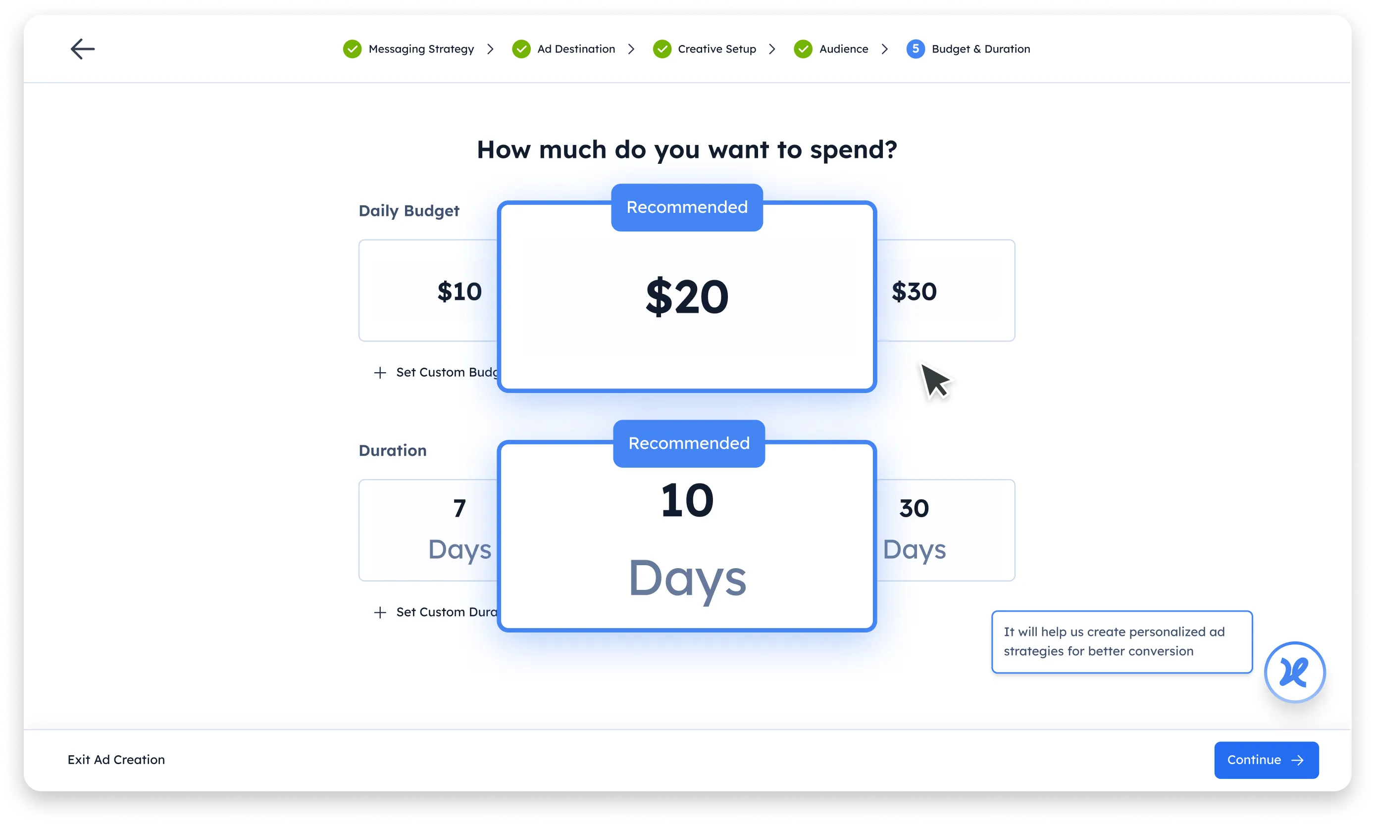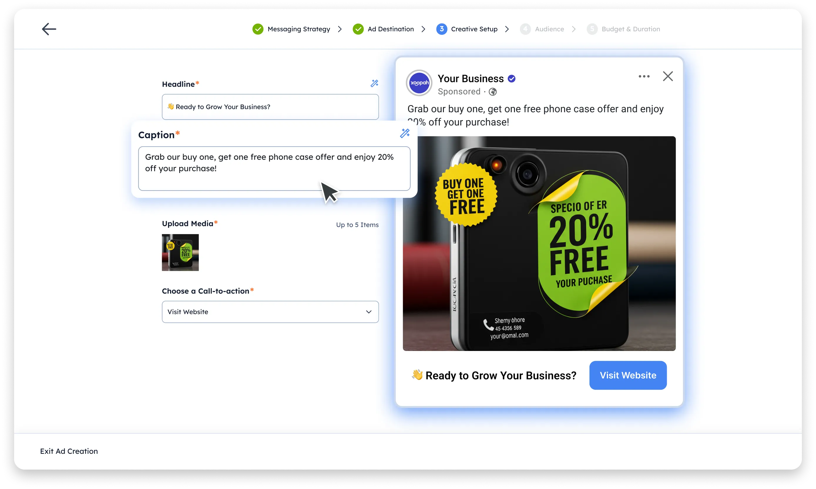 Don’t know what to say in your ad? Xoopah suggests headlines, captions, and CTAs that convert — so you can launch faster.